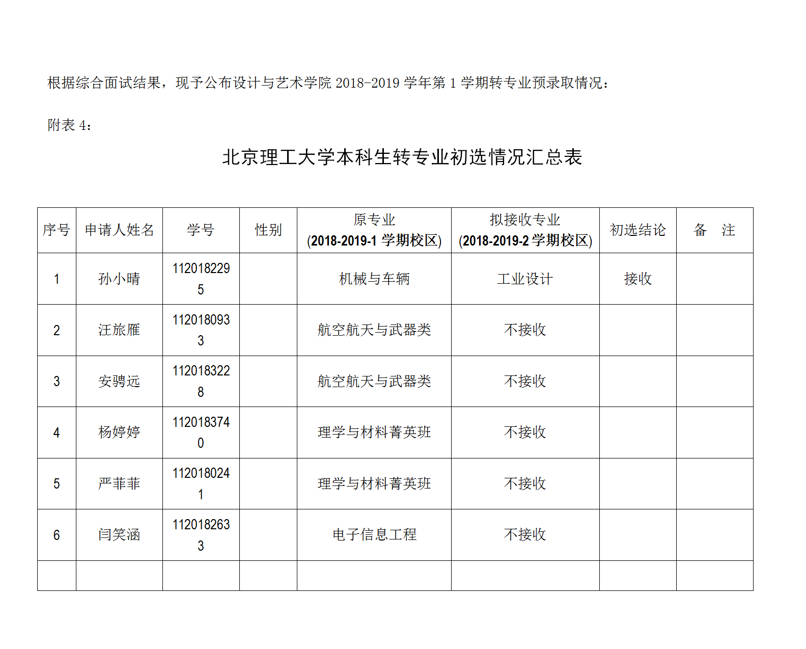 设计与艺术学院2018-2019学年第1学期转专业预录取情况